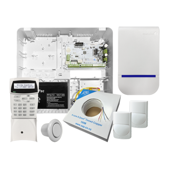 ESL-2 KIT-4 INCLUDES: -ESL-2 Control Panel -LCD keypad with full English text -DM12-7.5 12V 7.5Ah back up battery -PS209-R flush round internal siren 114dB -EC-SIREN external siren/strobe -4C2-100-CU 4 core 0.2mm tinned copper cable -2 x OPT-RXC-ST pet friendly quad sensor