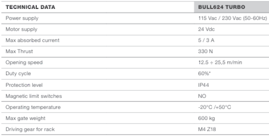 - 1 x B-BULL624TURBO - High speed 24VDC motor sliding gate motor. 230VAC power in to controller.